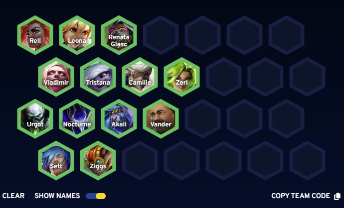 Renata Visionary reroll is one of many reroll compositions that are dependent on early augments for direction and strong tempo. Investment Strategy, Starry Night, or Prismatic Pipeline are some of the augments to consider when playing Renata. 2* Renata keeps you competitive all the way until Stage 4 when hopefully you should have some 3* come online. The composition punishes low rollers extremely hard and often does full damage to players who struggle to 2* their 4-cost carries. The main innovation in the line has been prioritizing Rell 3 and including early Chem Baron to take 100 or 200 cashouts for Renata and the Chem Baron items. Salvaged Contraption is quite solid and if you're able to cash out Lesser Duplicators, you can hit even quicker to maintain tempo. Sentinels, however, are hotly contested in several reroll lines so you will need to be flexible if you can't hit Rell or Singed.