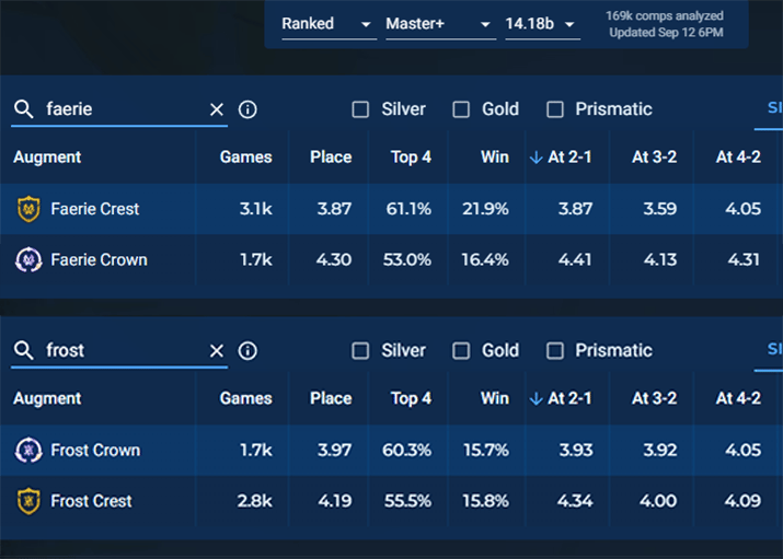Examining exactly what these augments do gives the answer. With Faerie Crown, you get a Tristana and a Giant Slayer. A 2-cost and an item that is primarily good for late game because Giant Slayer will not activate often early, if at all. With Frost Crown, you get a Swain and a Protector's Vow which is instant frontline that non-upgraded units on Stage 2 will struggle to kill. Meanwhile, Faerie Crest's power is relatively similar for the Gold augment giving you the Tristana and the ability to activate 3 Faerie quickly for an extra item -- almost like a prismatic Crown. Frost Crest grants a Zilean which is a support unit that isn't exactly lighting Stage 2 on fire.